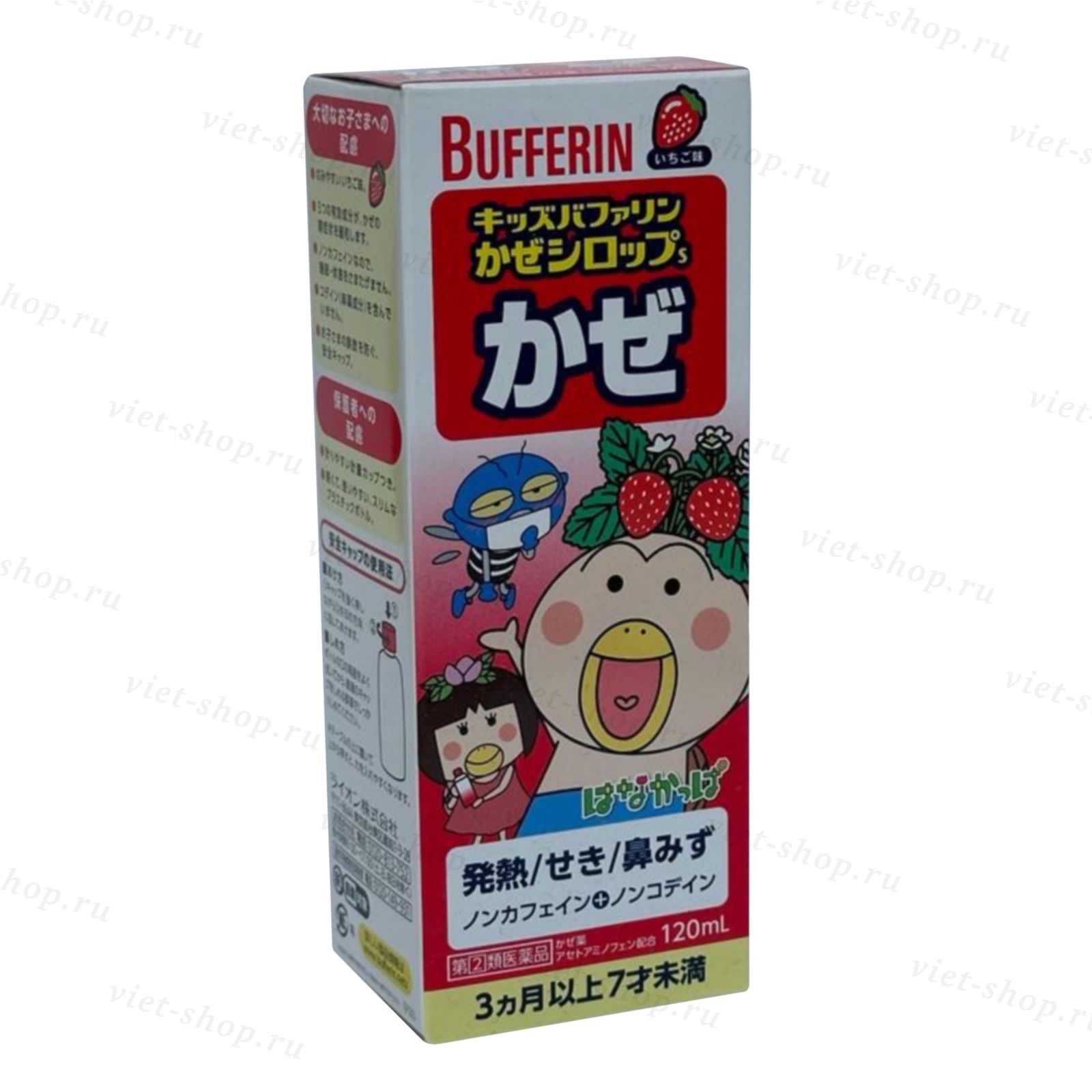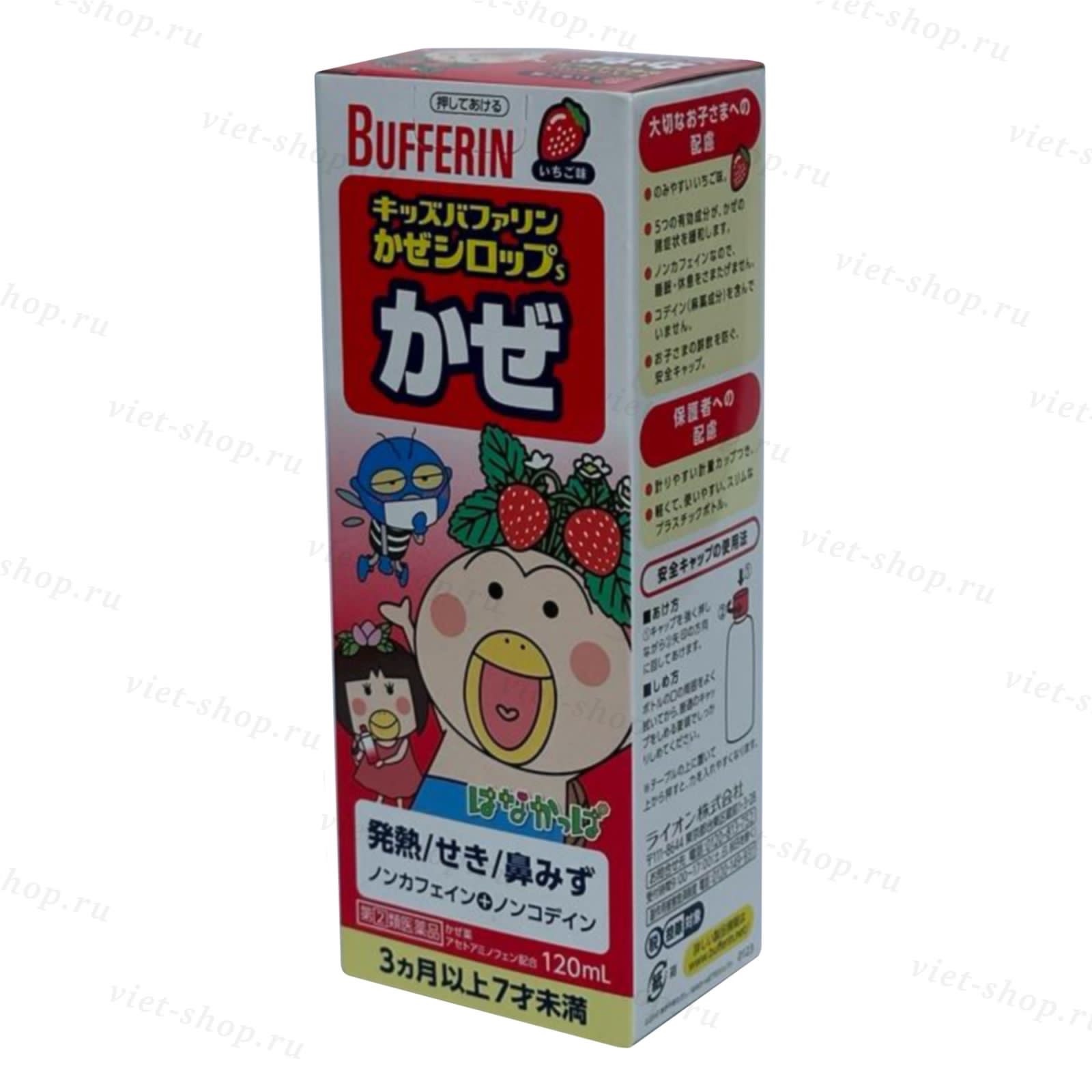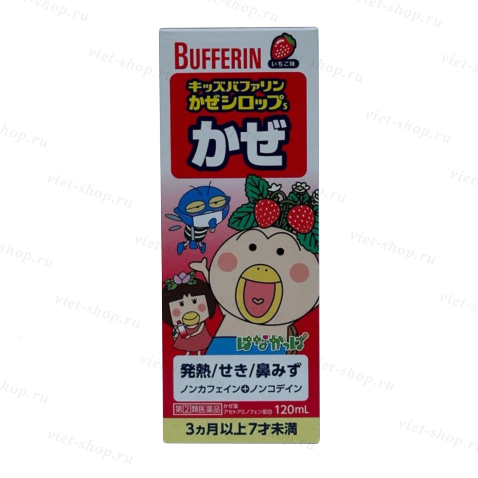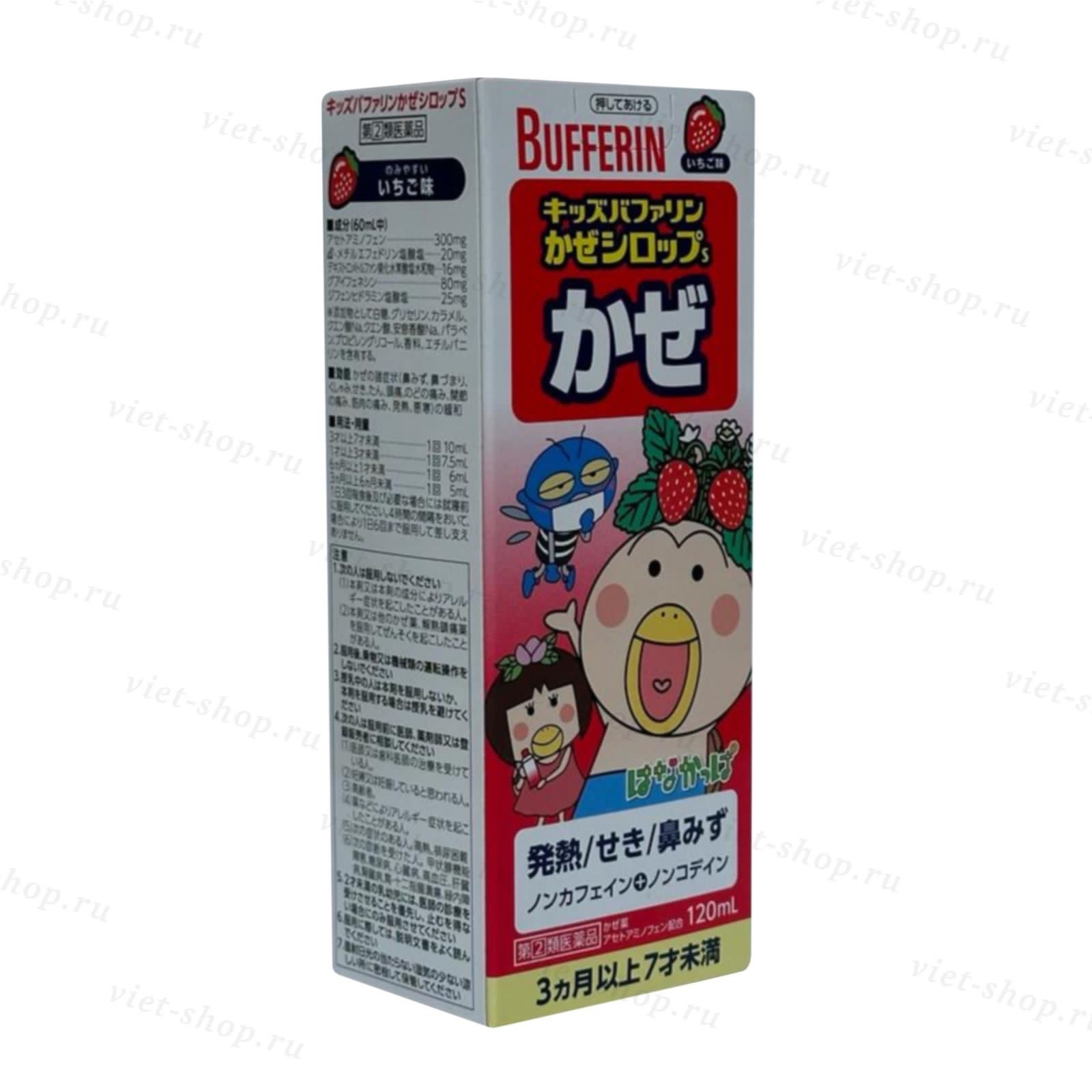 Японский детский сироп с клубничным вкусом для деток от 3 месяцев - 7 лет предназначен для облегчения симптомов простуды и гриппа: температуре, насморке, заложенности носа, чихание, головных болях, боле в горле, мышечных болях, болях в суставах, лихорадке, ознобе и кашле.