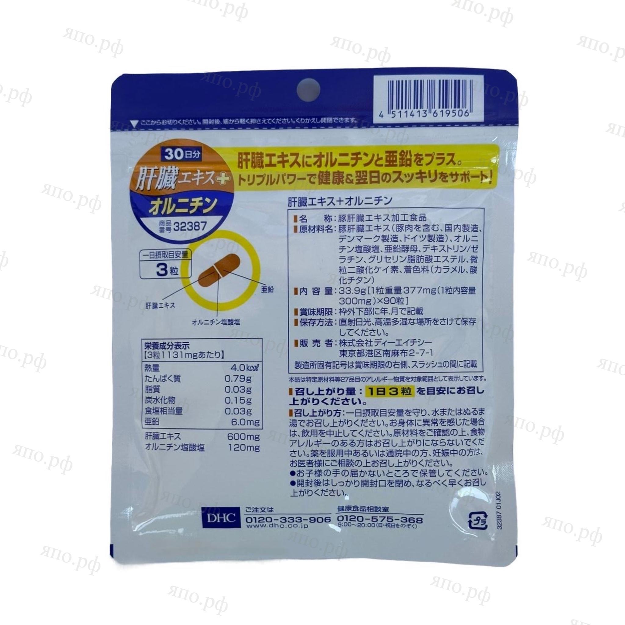 Энергетическая и пищевая ценность 3 капсул: 4 ккал, белки – 0,79 г, липиды – 0,03 г, углеводы – 0,15 г, солевой эквивалент – 0,03 г, экстракт свиной печени – 600 мг, орнитин – 120 мг, цинк – 6 мг.